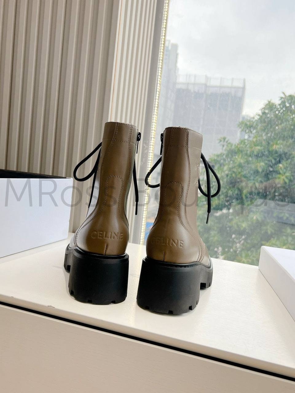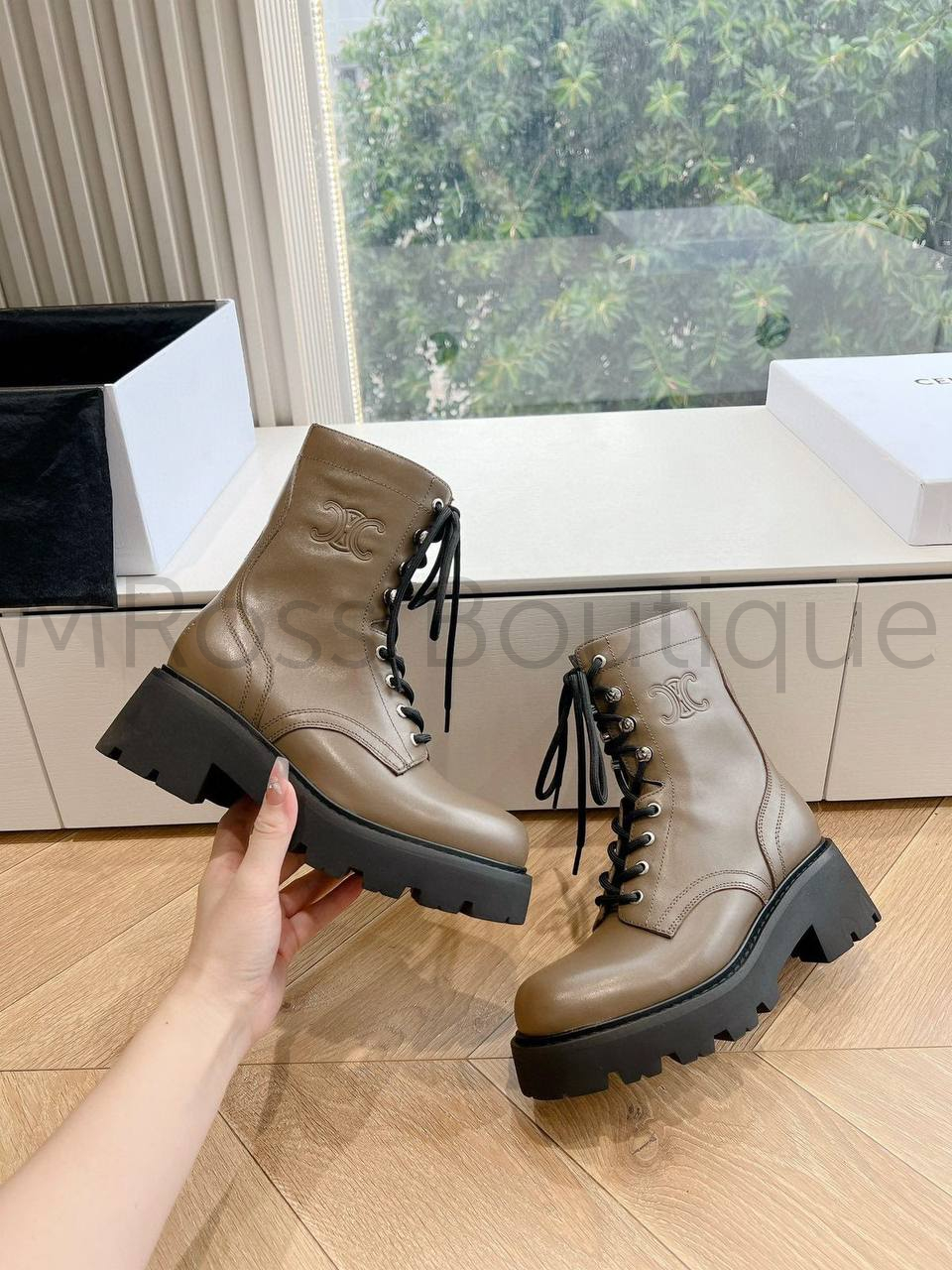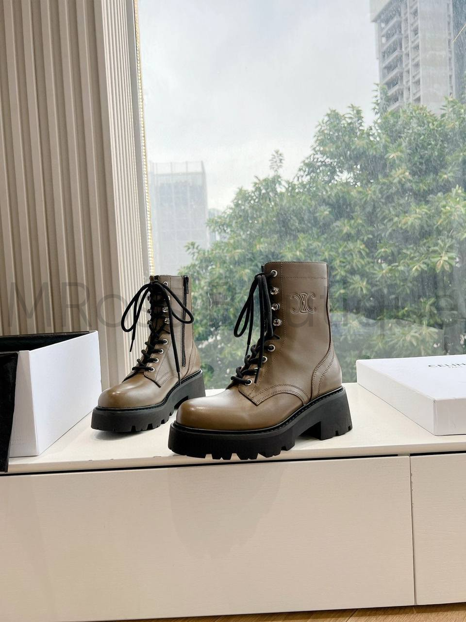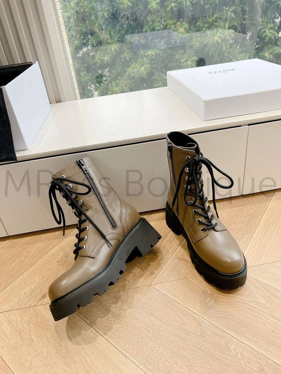 Женские кожаные ботинки Селин Триумф Рейнджерс (Celine Triomphe Rangers) премиум класса. Демисезонные ботинки цвета хаки на толстой подошве с брутальным визуалом благодаря высокой шнуровке станут отличной парой в осень. Для удобства модель имеет застежку молнию.