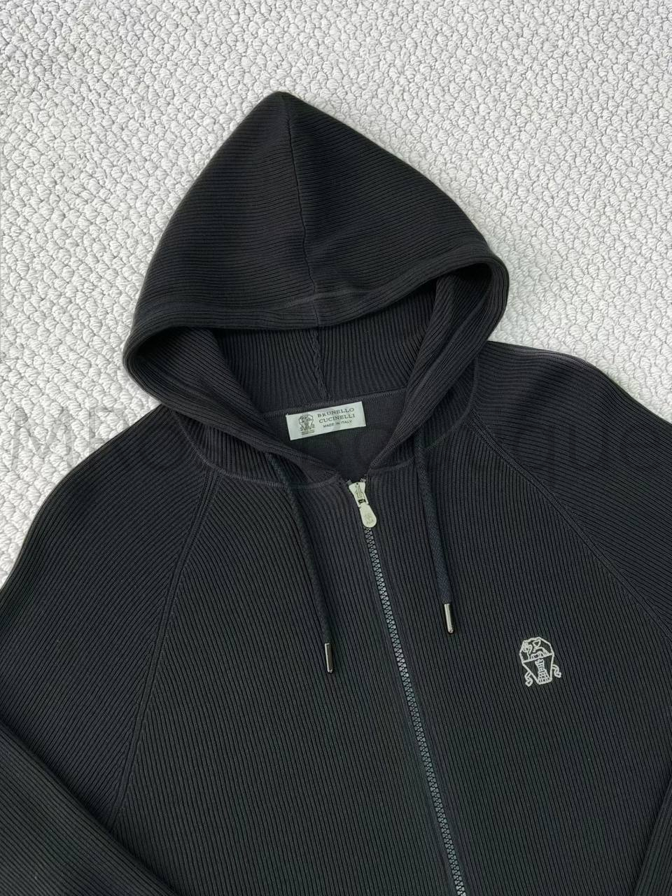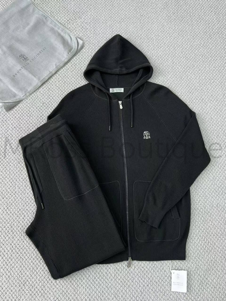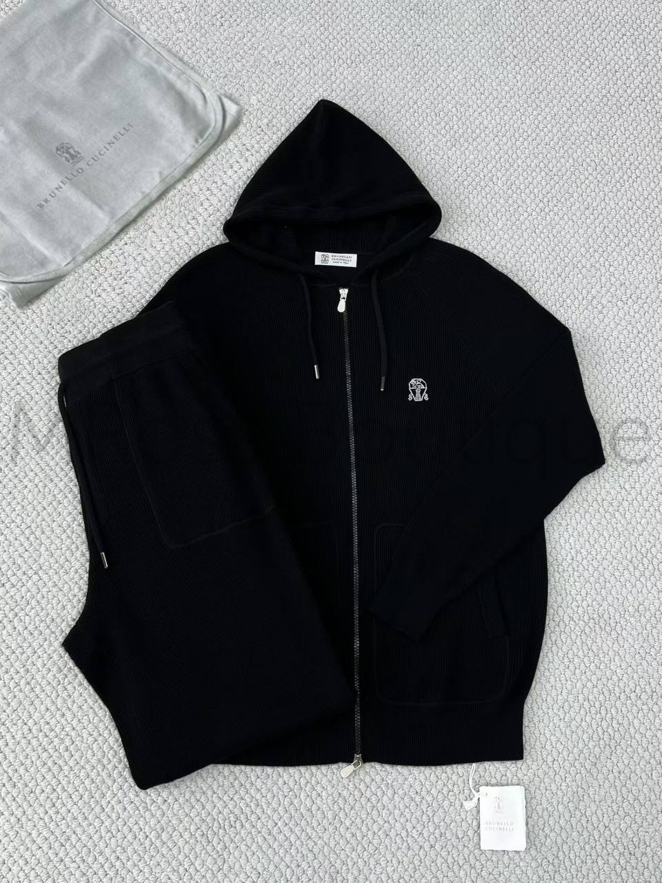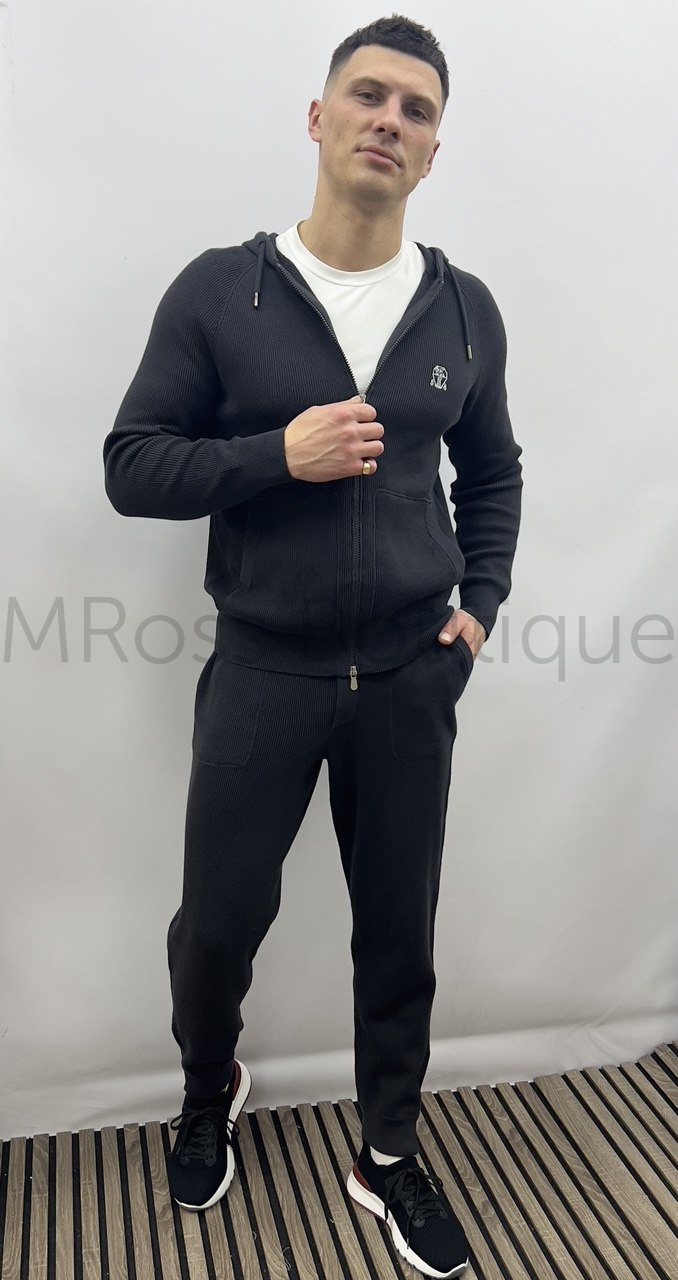 Brunello Cucinelli premium men's tracksuit made of black cotton jersey. A suit with a classic Brunello double zipper, with a hood on the jacket, an English elastic band on the pants and a zipper at the bottom that allows you to adjust the circumference of the shin, which can be useful when choosing shoes or just personal comfort / preferences. The crazy Brunello Cucinelli tracksuit, as always, was distinguished by its perfect cut and fit that accentuated the silhouette.