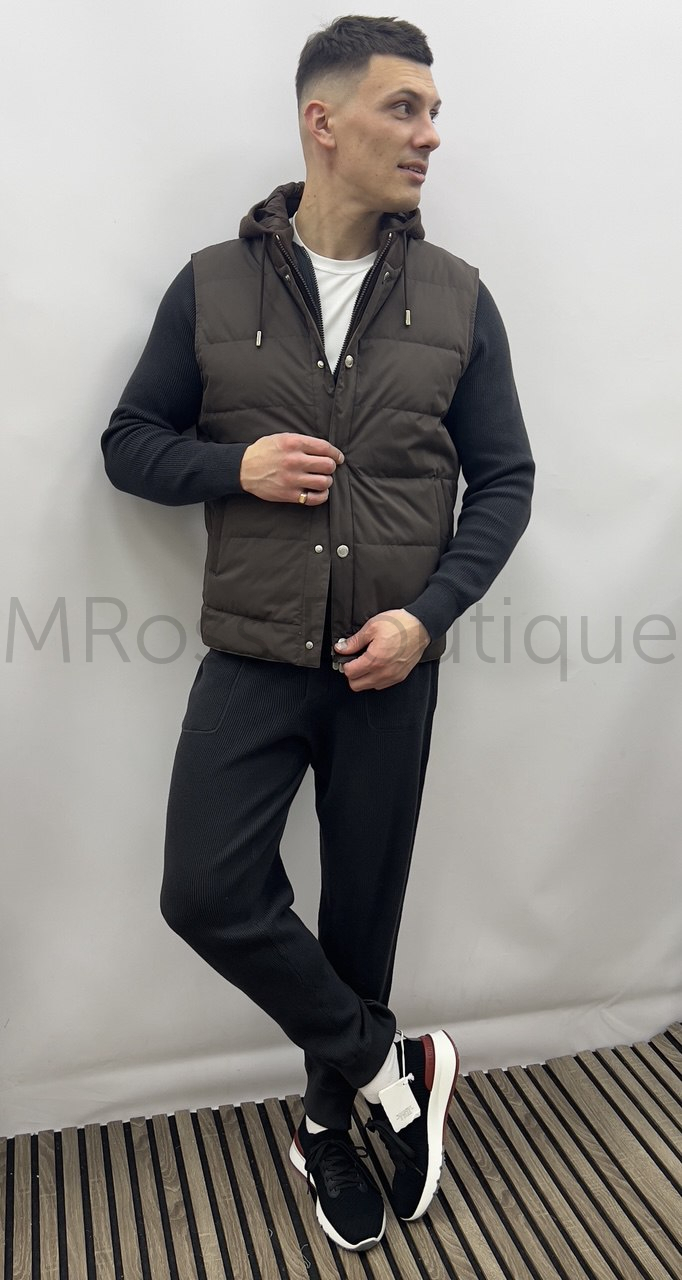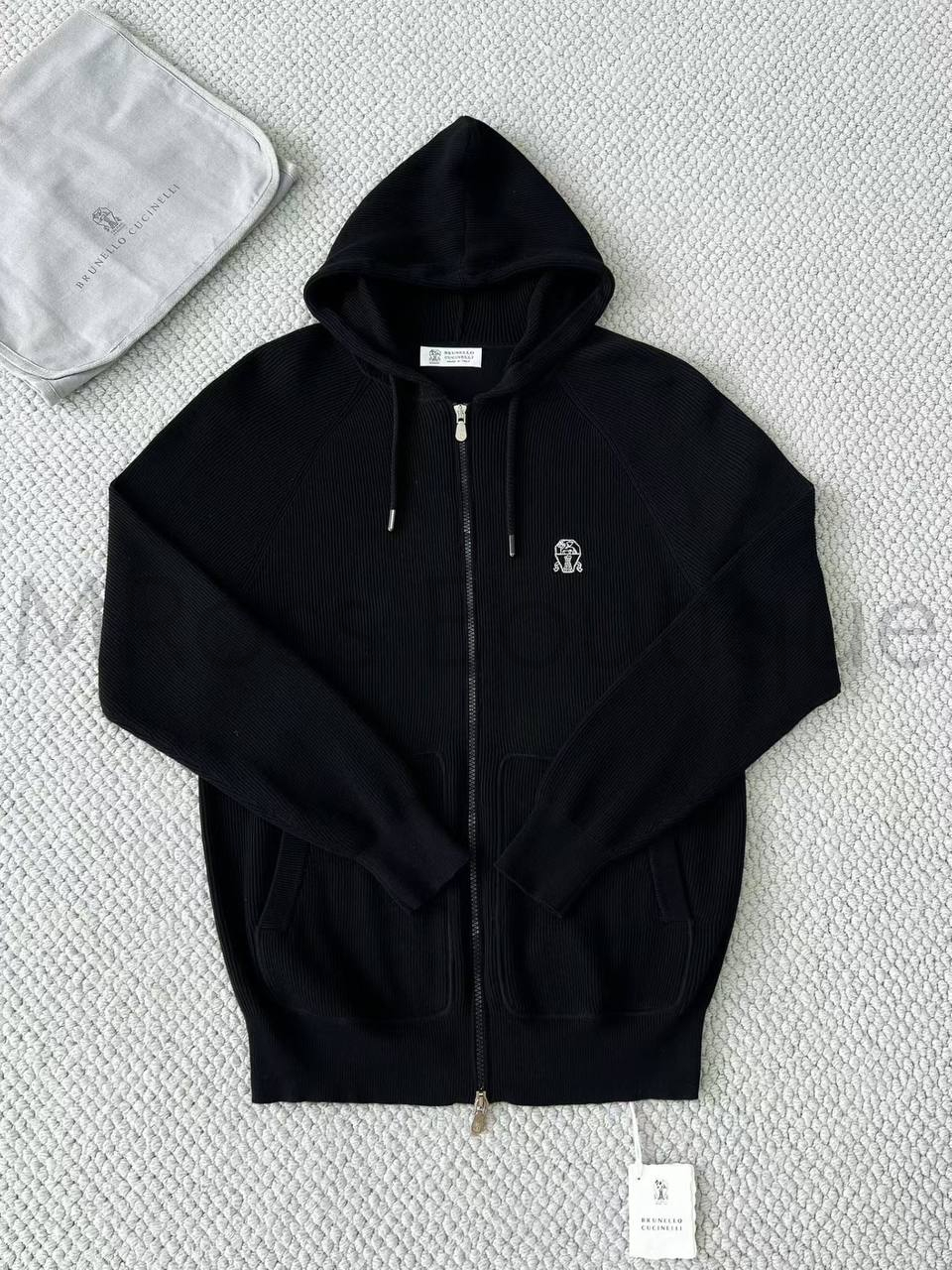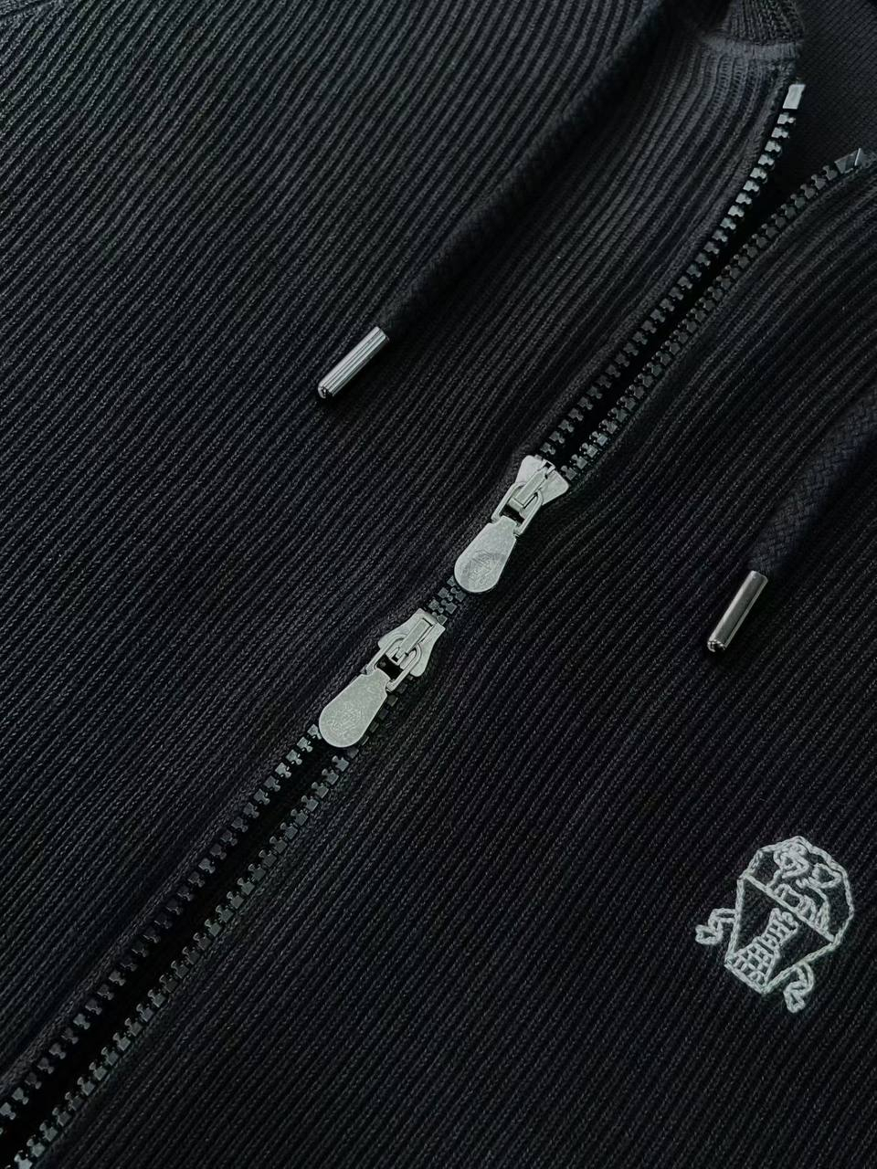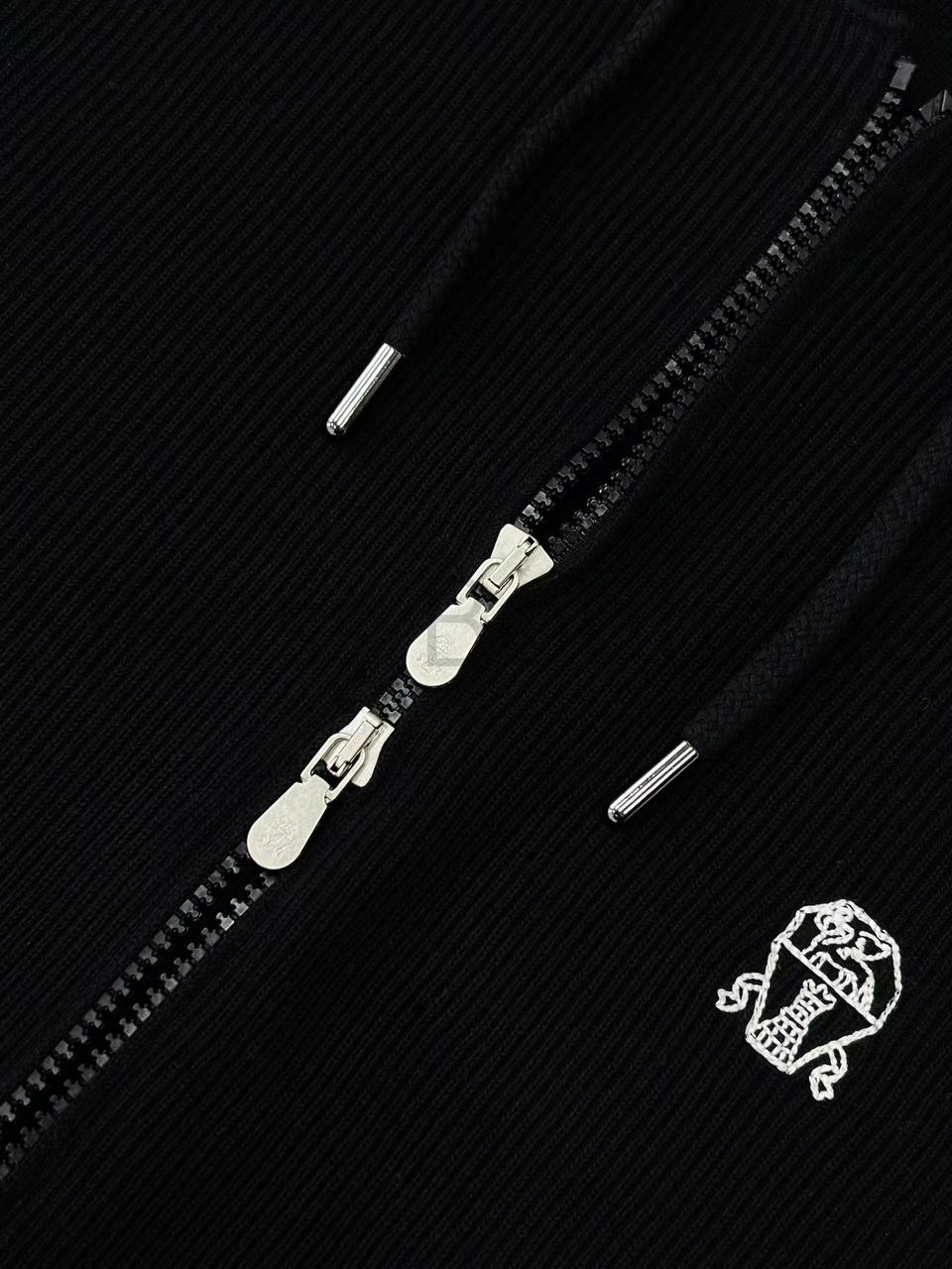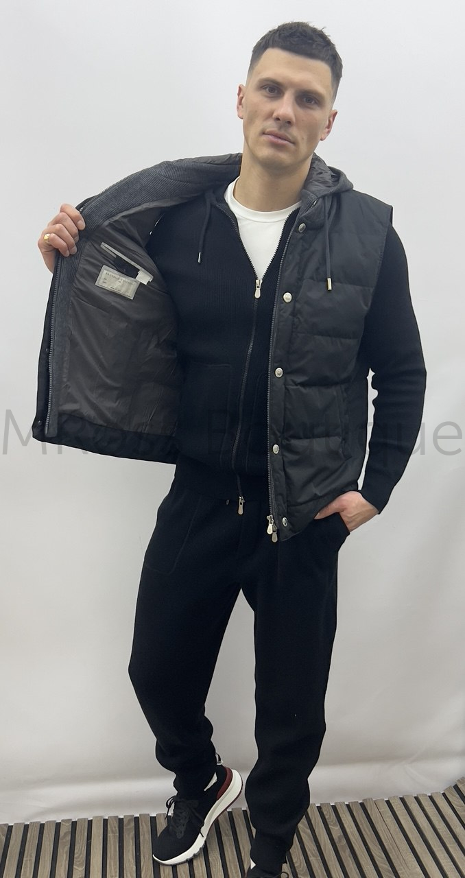 Brunello Cucinelli premium men's tracksuit made of black cotton jersey. A suit with a classic Brunello double zipper, with a hood on the jacket, an English elastic band on the pants and a zipper at the bottom that allows you to adjust the circumference of the shin, which can be useful when choosing shoes or just personal comfort / preferences. The crazy Brunello Cucinelli tracksuit, as always, was distinguished by its perfect cut and fit that accentuated the silhouette.