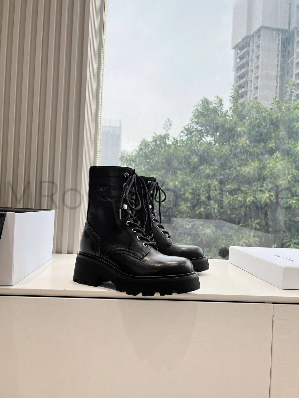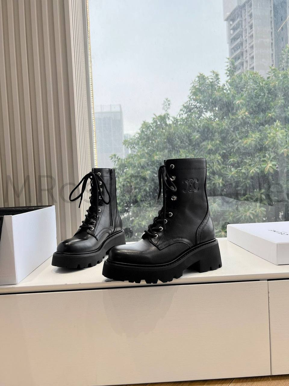 Женские кожаные ботинки Селин Триумф Рейнджерс (Celine Triomphe Rangers) премиум класса. Черные демисезонные ботинки на толстой подошве с брутальным визуалом благодаря высокой шнуровке станут отличной парой в осень. Для удобства модель имеет застежку молнию.